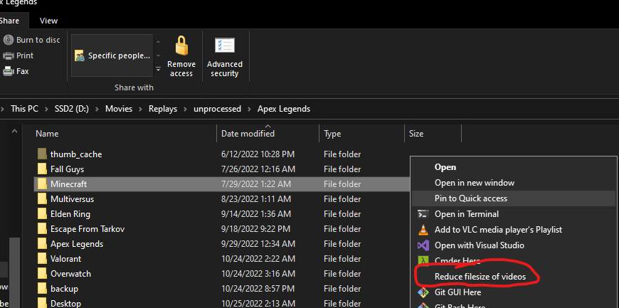 FFmpeg-folder is a simple Windows Context Menu tool that allows you to right click on a folder and reduce the filesize of all videos in the folder and all subfolders.