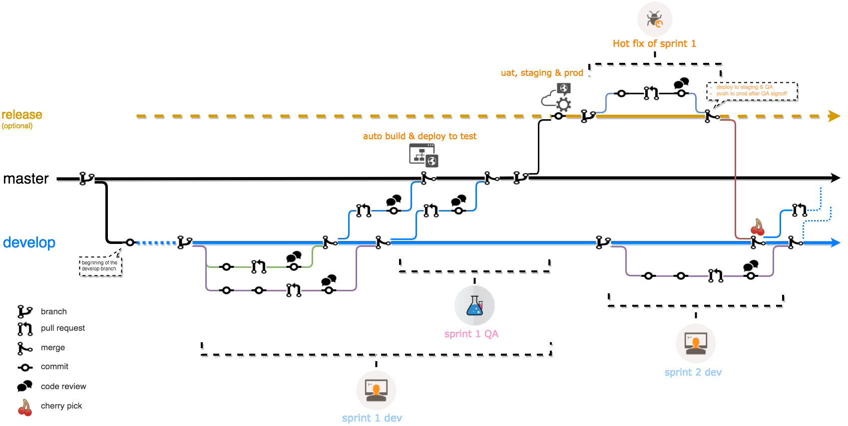 git statusto check local statusgit remote updateto bring remote status up to dategit checkoutto switch to branchgit checkout -b xxxxto create & checkout new branch based on current working branch.git add .to add all changes to stagegit commit -m 'xxxxx'commit staged changes to local repo with commentgit push -u origin xxxxxpush local commits to remote origin repogit pull --rebaseto get the latest code with rebase.git rebase --continuewhen has pull.rebase conflict, go resolve the conflict by editing the file, thengit add .and thisgit rebase developto rebase from develop branch to current working branch (feature branch).git log --oneline --graph --color --since=2.weeksprint out git history log with graph within 2 weeksgit stashsave the current none commited changes, so that be able to switch to other branch.git cheery-pick xxxxxx&git cherry-pick --continue -m 'commit message', xxxxxx is 6 digit SHA1 commit hash, if there merge conflict, user the--continueto commit the merge result.