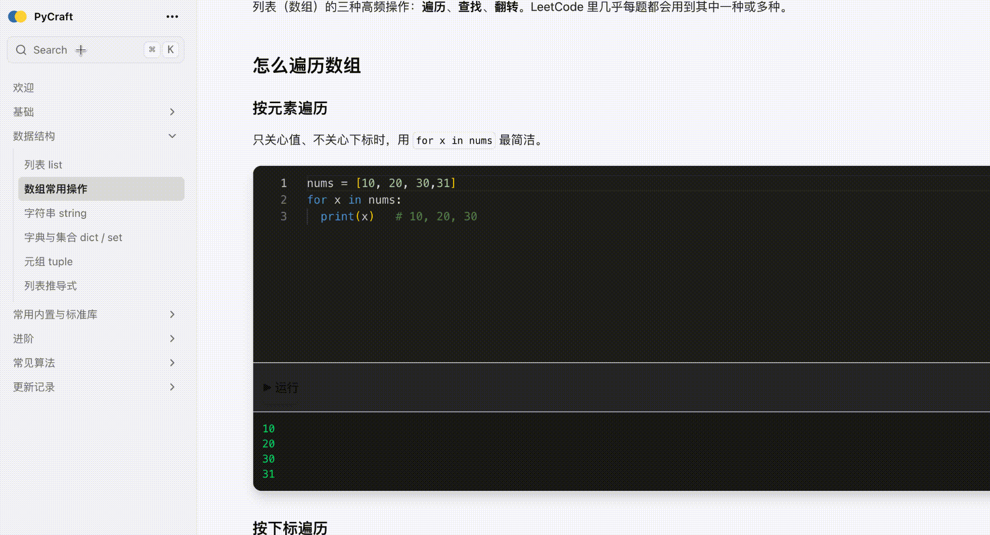 面向 LeetCode 的 Python 语法与基础教程,在浏览器里写代码、看结果,无需安装环境。