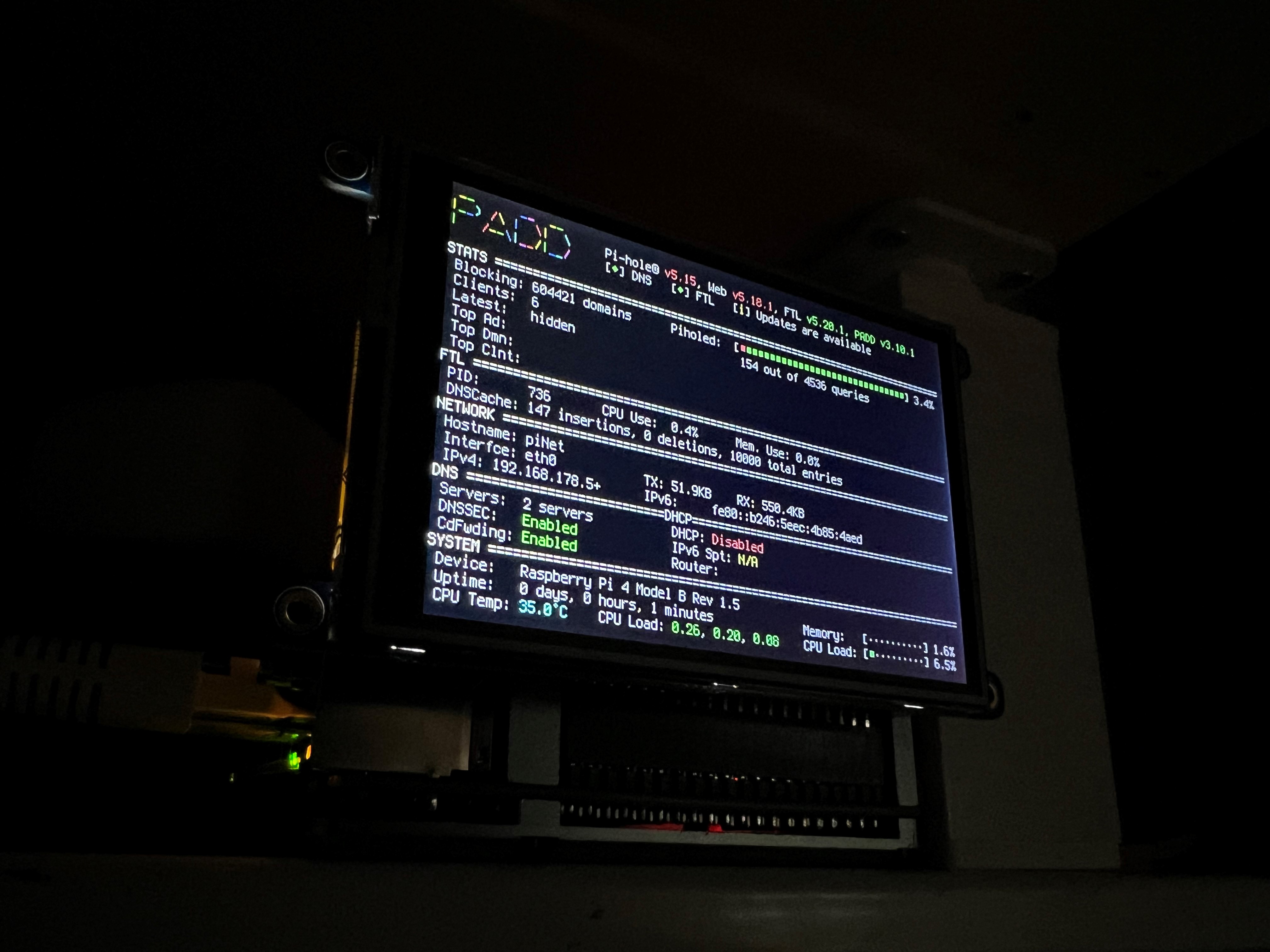 - an automatic adblocker (via piHole) that optionally shows its current status on a nifty TFT display attached to the Raspberry Pi (via PADD),