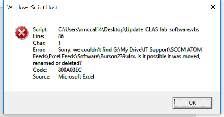 After the script runs, Update_CLAS_lab_software.vbs (the script that opens and closes the Excel files) displays the following message: