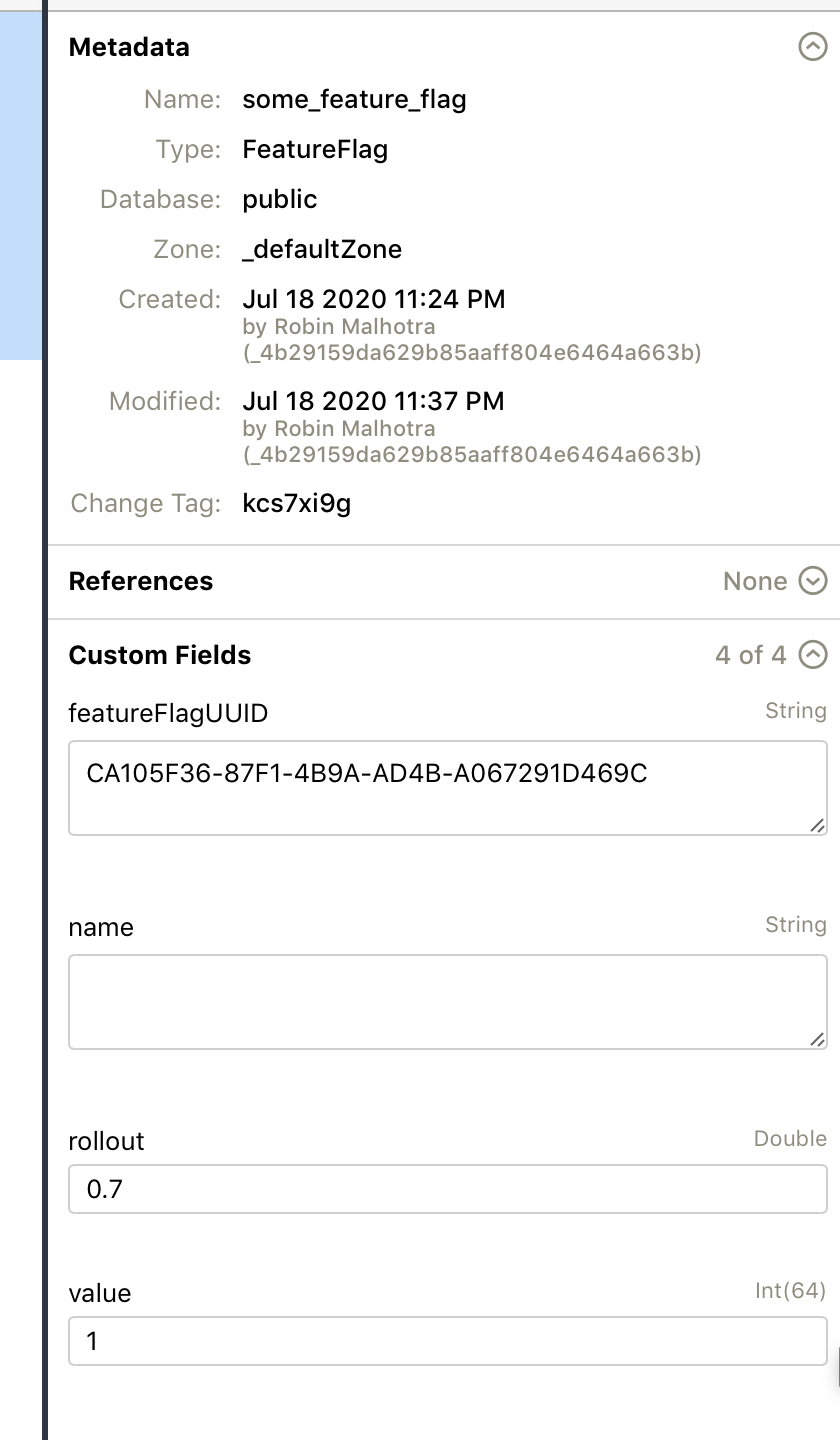 • Create feature flags somehow You can use the test app, or simply do it via the CloudKit dashboard. This is roughly the schema you're looking for (I'm working on making this experience better, feel free to open an issue if you need help!)