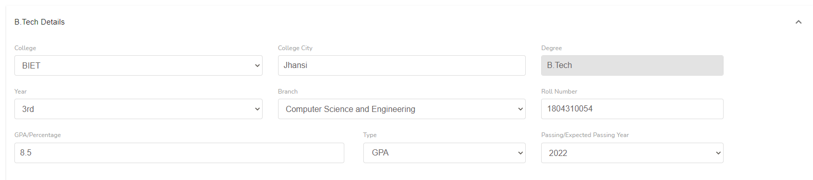 At profile/dashboard page, there should be one more field, passout, in academic section for B.tech Information(input value for that select field(to be saved in database): 'passout') #1