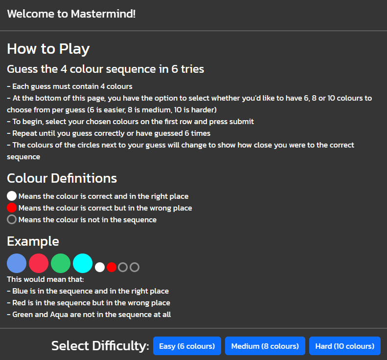 - To begin, select your chosen colours on the first row and press submit, and repeat this until you guess correctly, or have guessed 6 times.