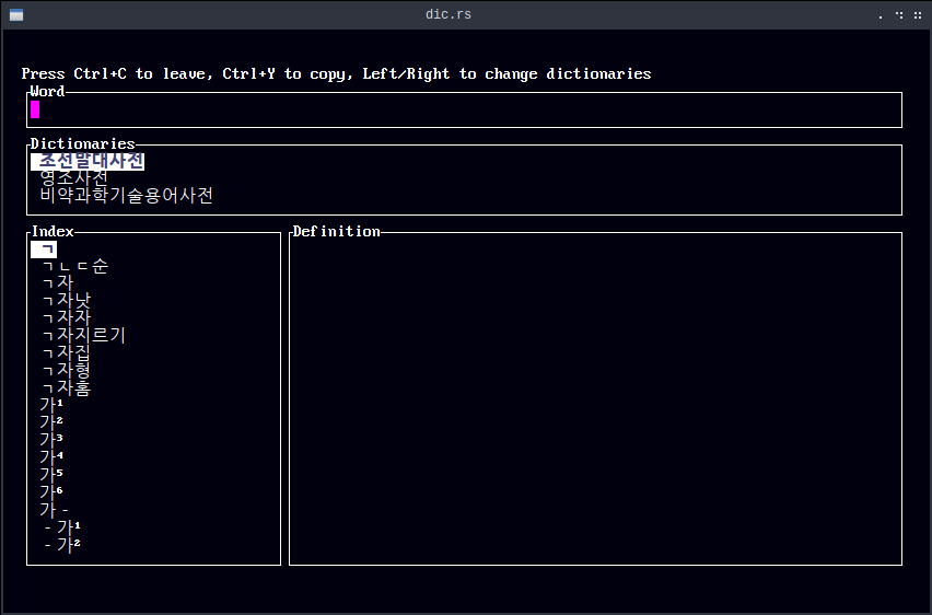 Dic.rs is a simple TUI developed in Rust with tui-rs to browse dictionaries obtained as part of this project. Dictionaries are stored as SQLite databases in the dics/ folder. See below, Dictionaries to download dictionaries.