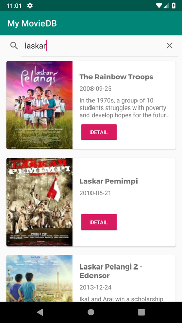 - Saat memilih salah satu item di list, tampilkan screen activity/fragment baru yang memuat detail item tersebut