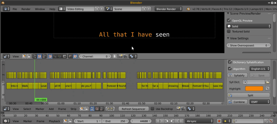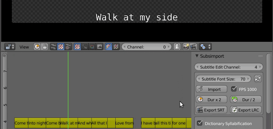 Subs import is an addon for Blender that allows users to create and edit subtitles for movies or music. The keyboard shortcuts and automatic syllable separation tools make it a very fast tool.