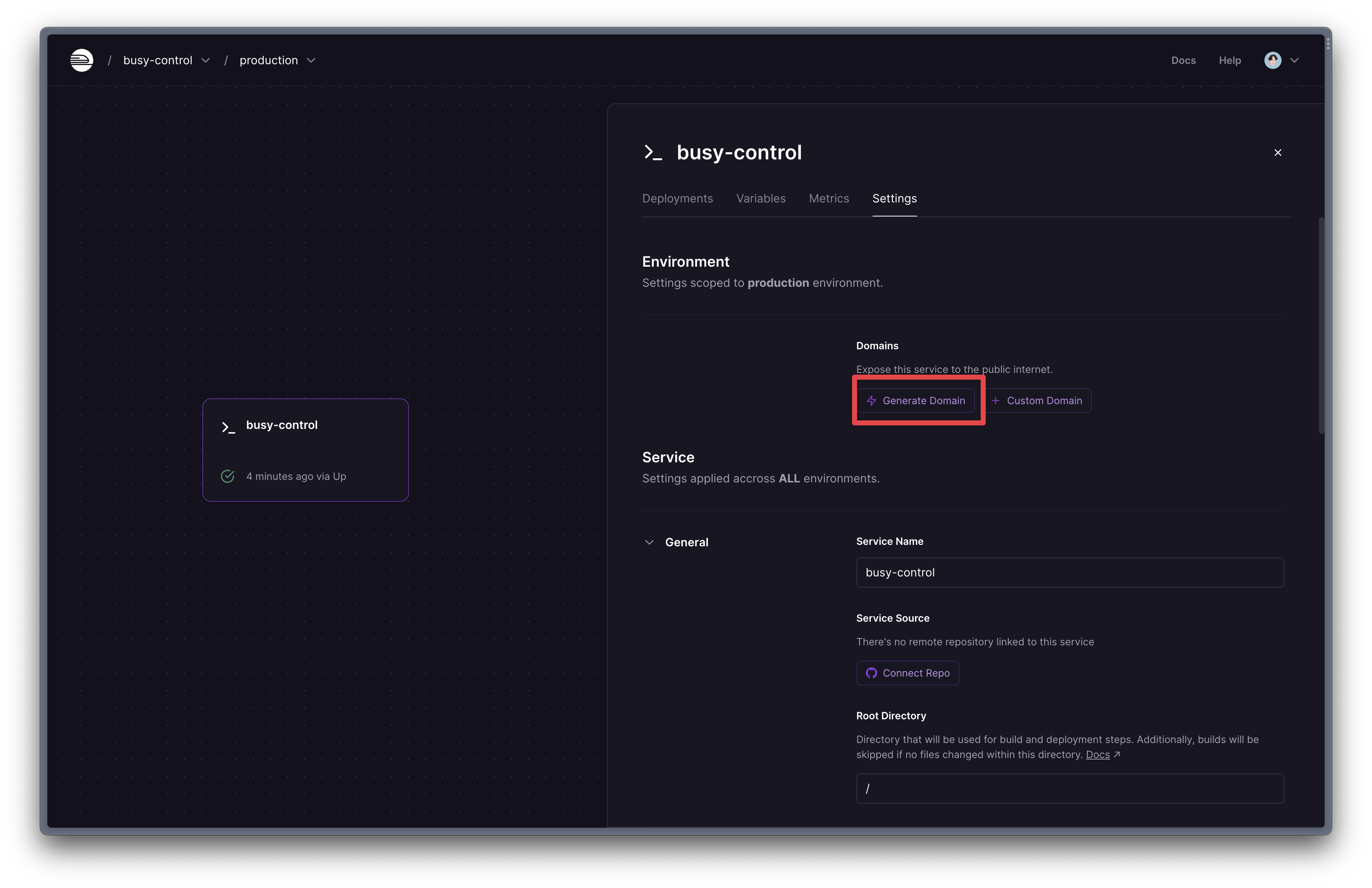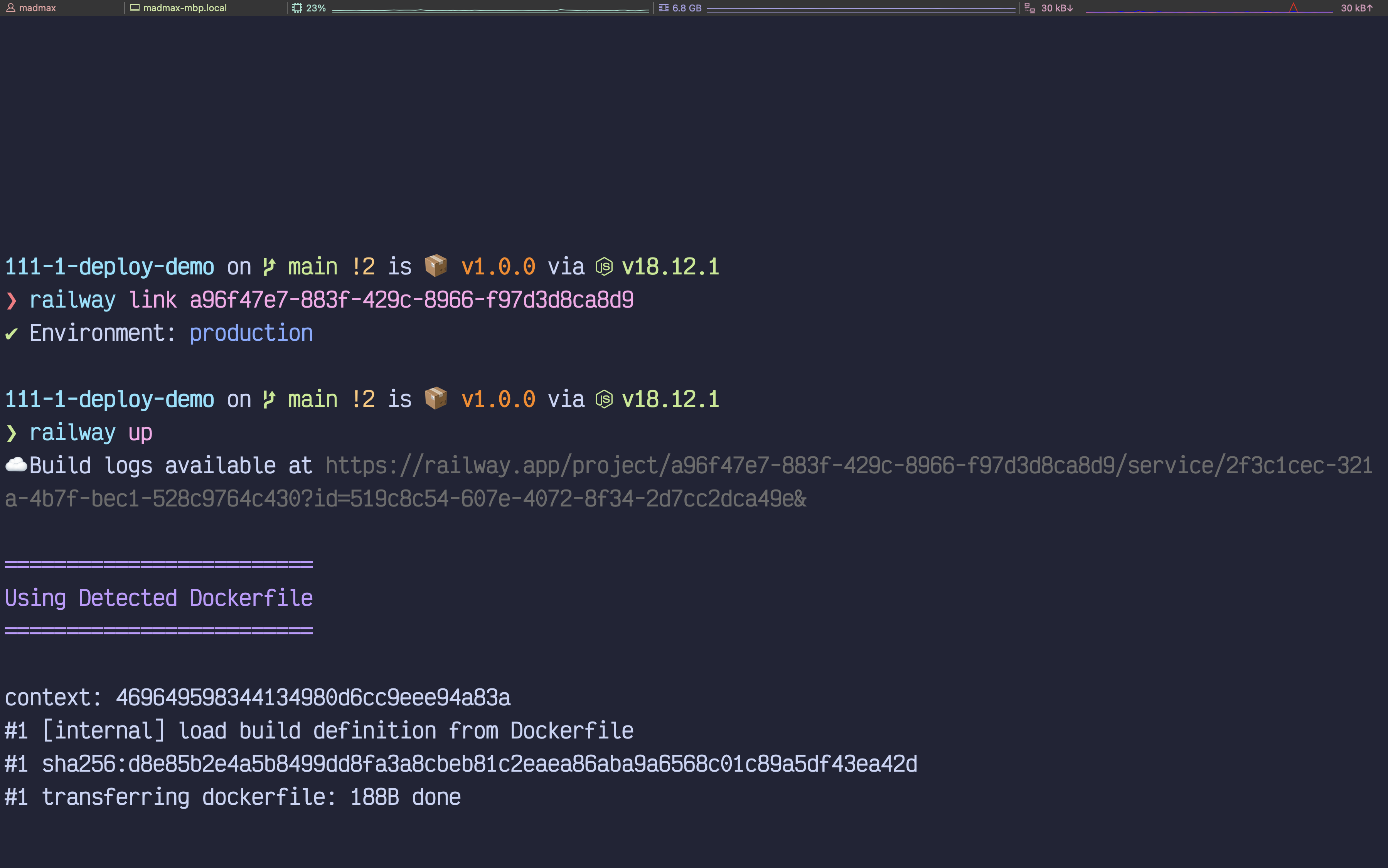 go to your project page on Railway.app (or by clicking the link in the terminal), it should be building your docker image