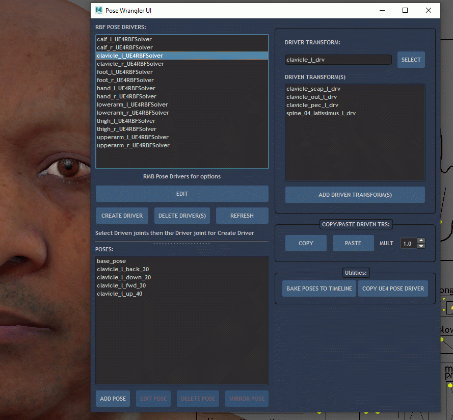 PoseWrangler is a simple UI to create and edit pose-driven relationships in Maya using the MayaUE4RBF plugin. This plugin is distributed by Epic Games and installed by Quixel Bridge, initially with MetaHuman source files.