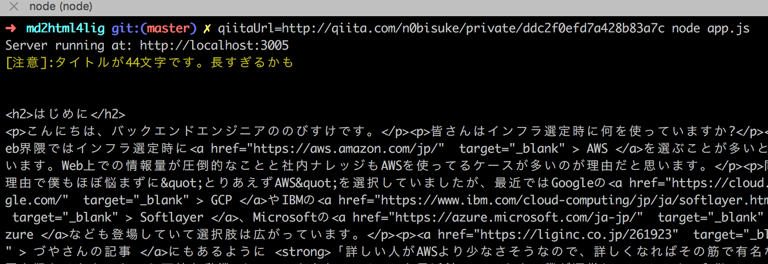 qiitaUrl=<ここにQiitaのURL> node app.jsで起動する