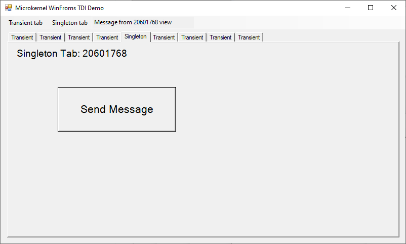 Fig. 3 - The main form and child TDI transient tabs and the singleton tab. The main menu also shows the message from the singleton tab. To close the tab focus the "Send Message" button and press the Del key.
