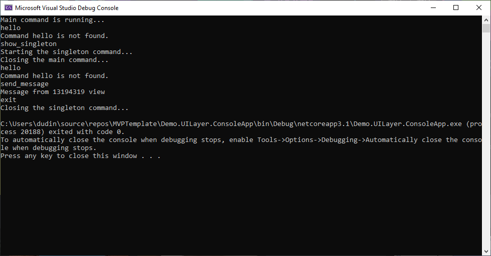 Run<TPresenter>orRun<TPresenter, TViewModel>to run a presenter. When aViewaccessed for the first time, a DI - container resolve the view by its interface, decoupling a concrete implementation of a gui framework (WF, WPF, Console) component. - Use