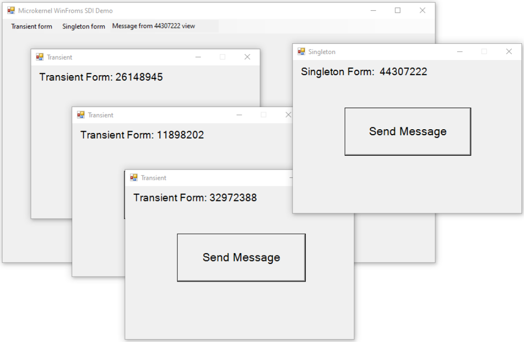 Fig. 2 - The main form and child SDI transient forms and the singleton form. The main menu also shows the message from the singleton form.