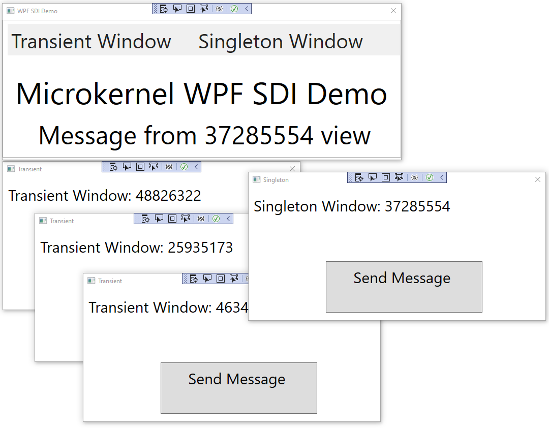 Fig. 4 - The main window and child transient windows and the singleton window. The main window also shows the message from the singleton window.