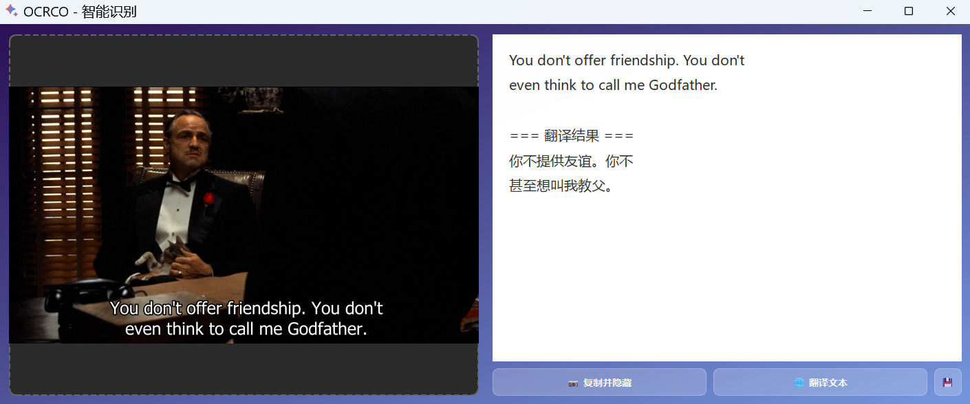OCRCO 是一款基于 Python + PyQt6 开发的轻量级 Windows 桌面 OCR 工具。它集成了 WeChatOCR 本地引擎,能够快速、精准地识别屏幕截图中的文字,并提供实时翻译功能。