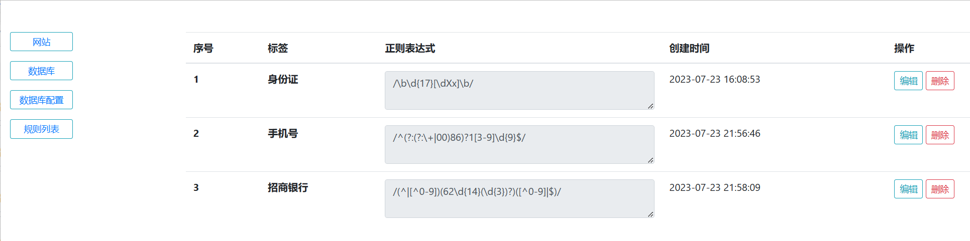 在此处添加检测规则并对应标签,当在数据库中检测到符合的规格将会展示在菜单“数据库”,并打上标签
