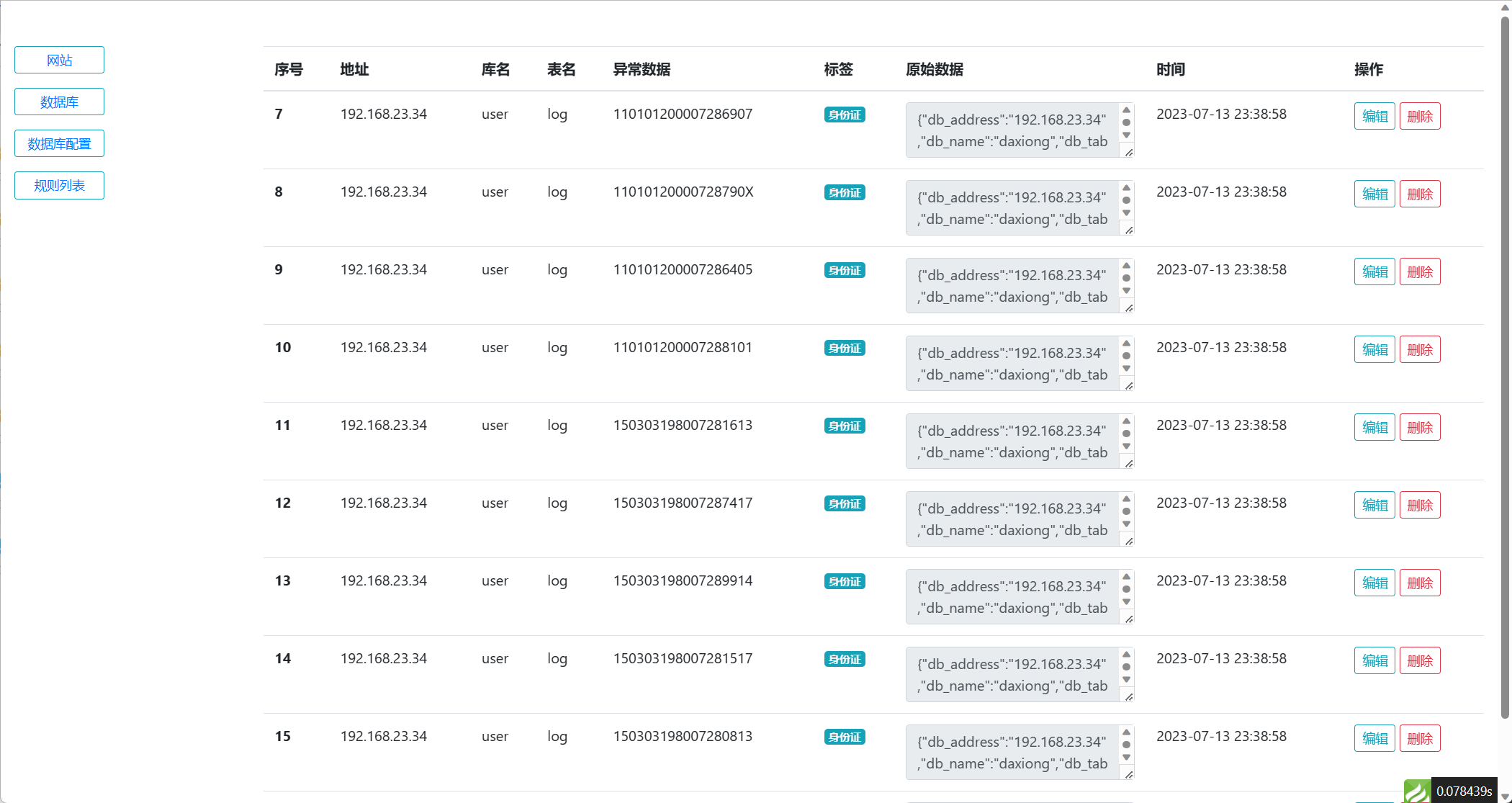 下图中可以看到:已将不符合数据安全规范的异常数据标记出来,并告知异常数据来源自某数据库、数据表。