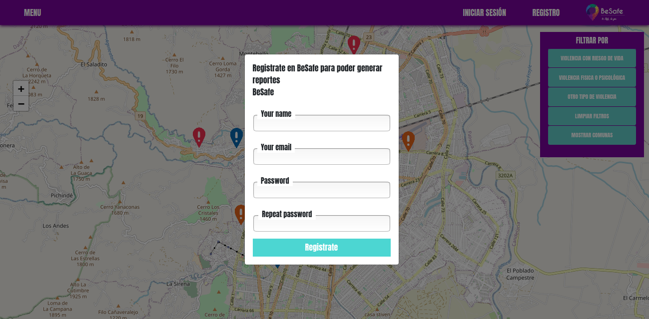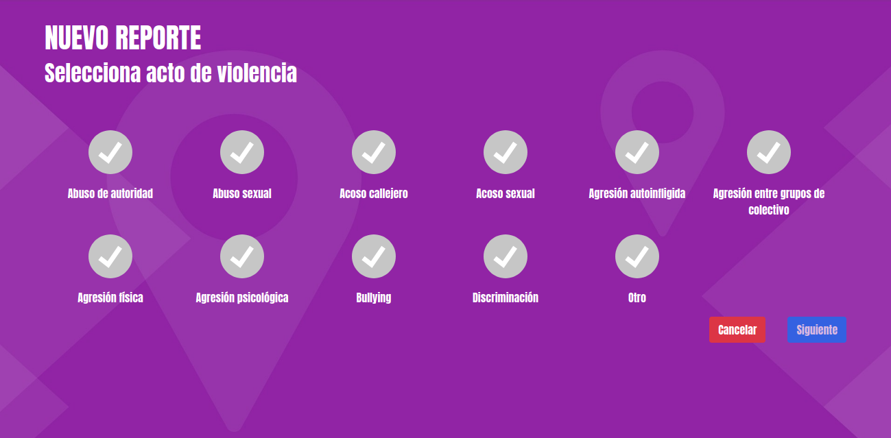 Application that allows reporting and registering cases of violence against the LGTBI community to obtain a preview of the city map in real time that delimits the areas where these types of acts occur or have occurred and which areas are safe, generating statistical data that indicate which groups within the community are the most affected and determine which places in Cali are the ones that present the most cases of violence, in which neighborhoods and under what circumstances they occurred, on what days, at what time, who was the aggressor, whether it was reported or not.