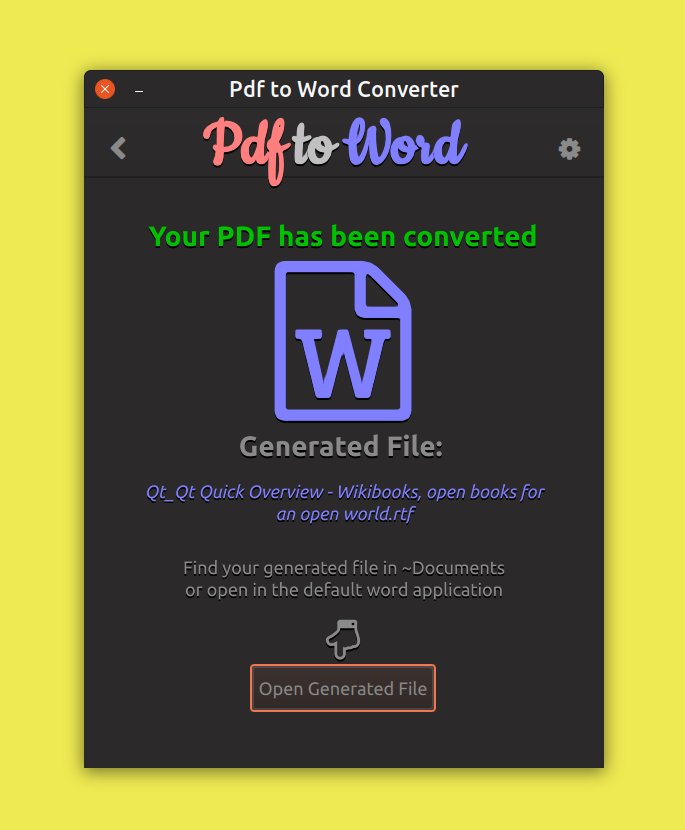 This is a free and open source pdf to word converter application written using Qt/Qml 5.11. It support converting any pdf file to an editable word file. It use the LibreOffice command line tool as it work as a GUI.