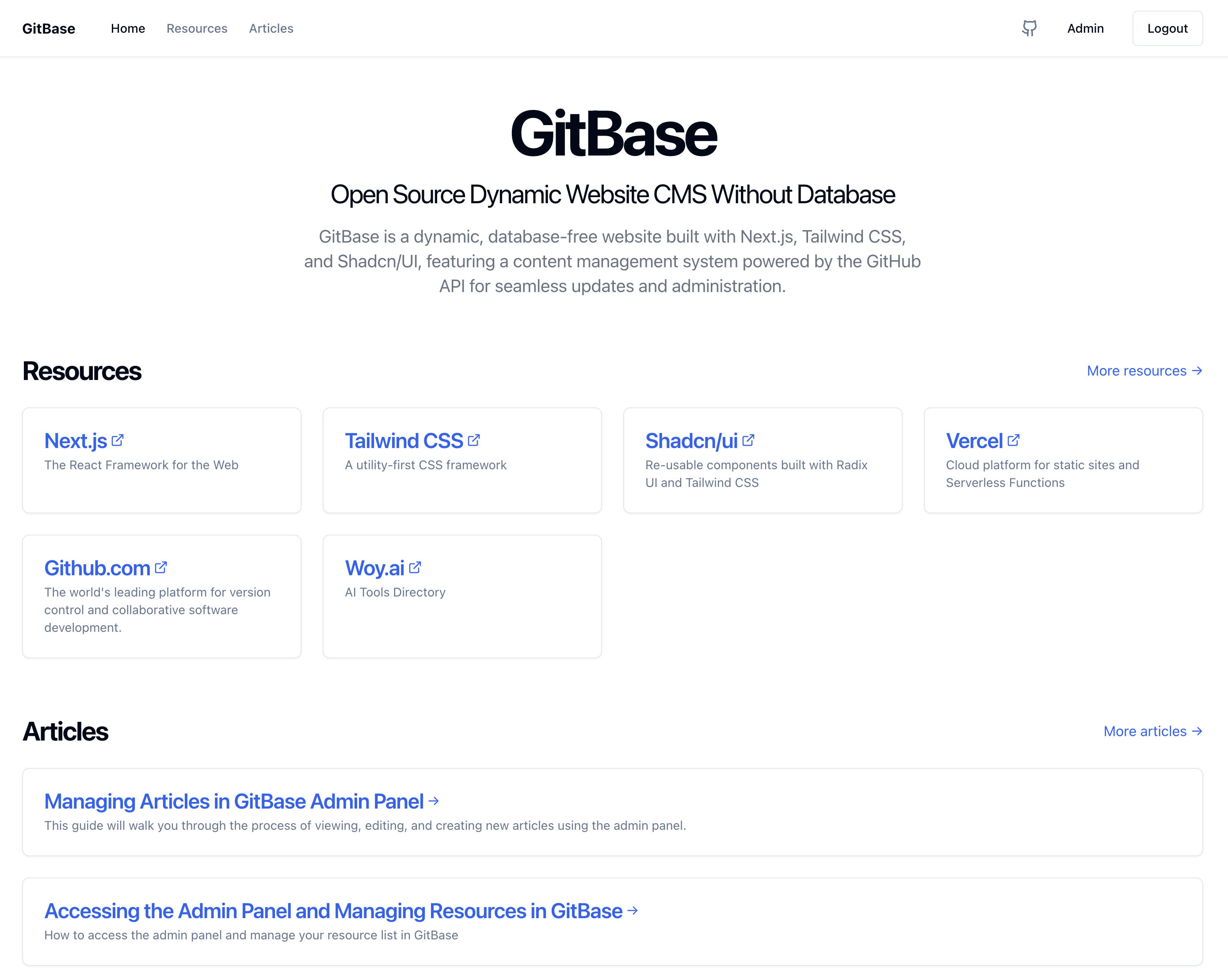 GitBase is an open-source dynamic website solution without a traditional database, built with Next.js, Tailwind CSS, and Shadcn/UI. It leverages GitHub as a content management system, providing a seamless way to create and manage website content.
