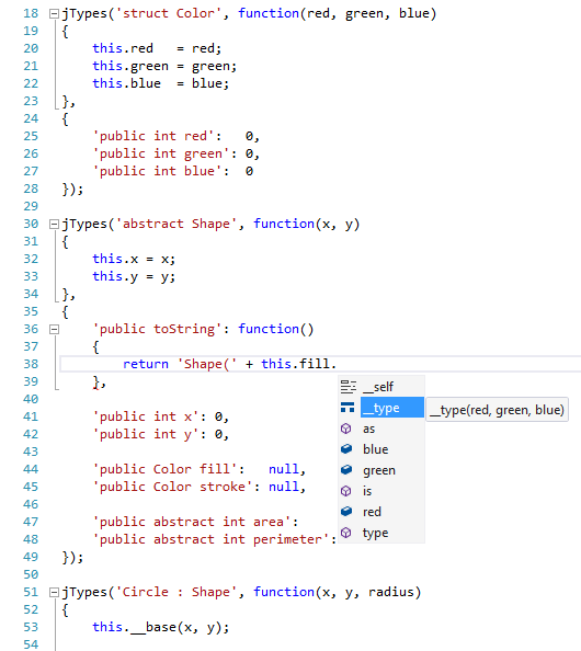 var white = new jTypes.System.Drawing.Color(255, 255, 255);These scopes also allow base classes and type constraints to be resolved from either the current or parent namespaces without requiring a fully qualified name. In the next example, an abstract class Shape is compiled in the scope of the System.Drawing.Drawing2D namespace: