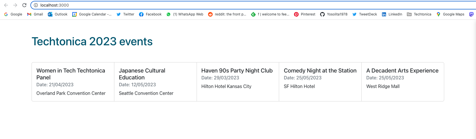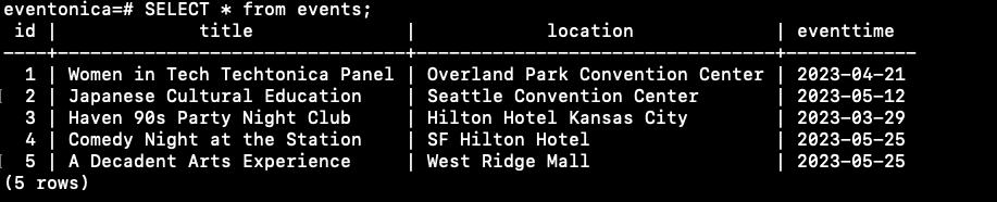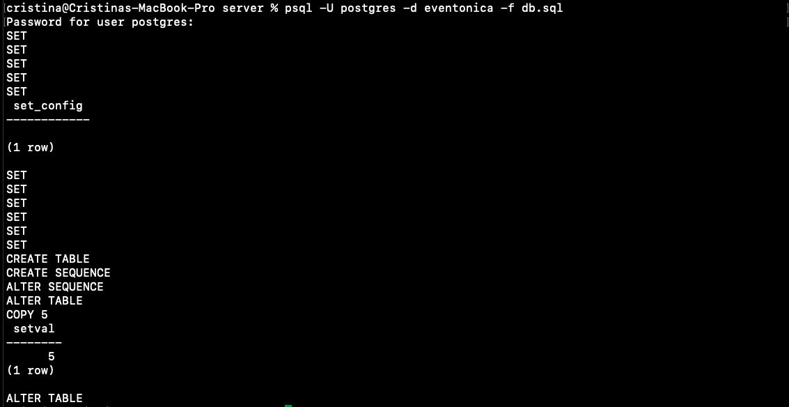Back in the terminal window with the project go inside the server directory and run the command psql -d eventonica -f db.sql that will create a table events with 5 rows inside your db eventonica.