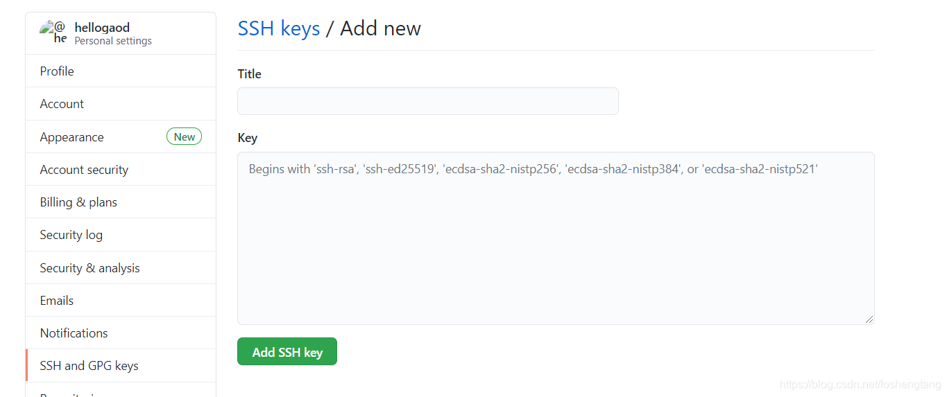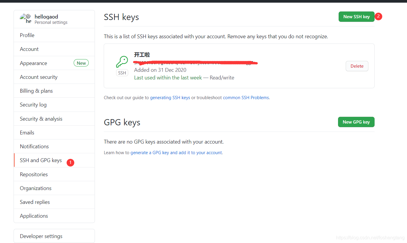 第2步:登陆GitHub,打开“Settings”,“SSH Keys”页面: