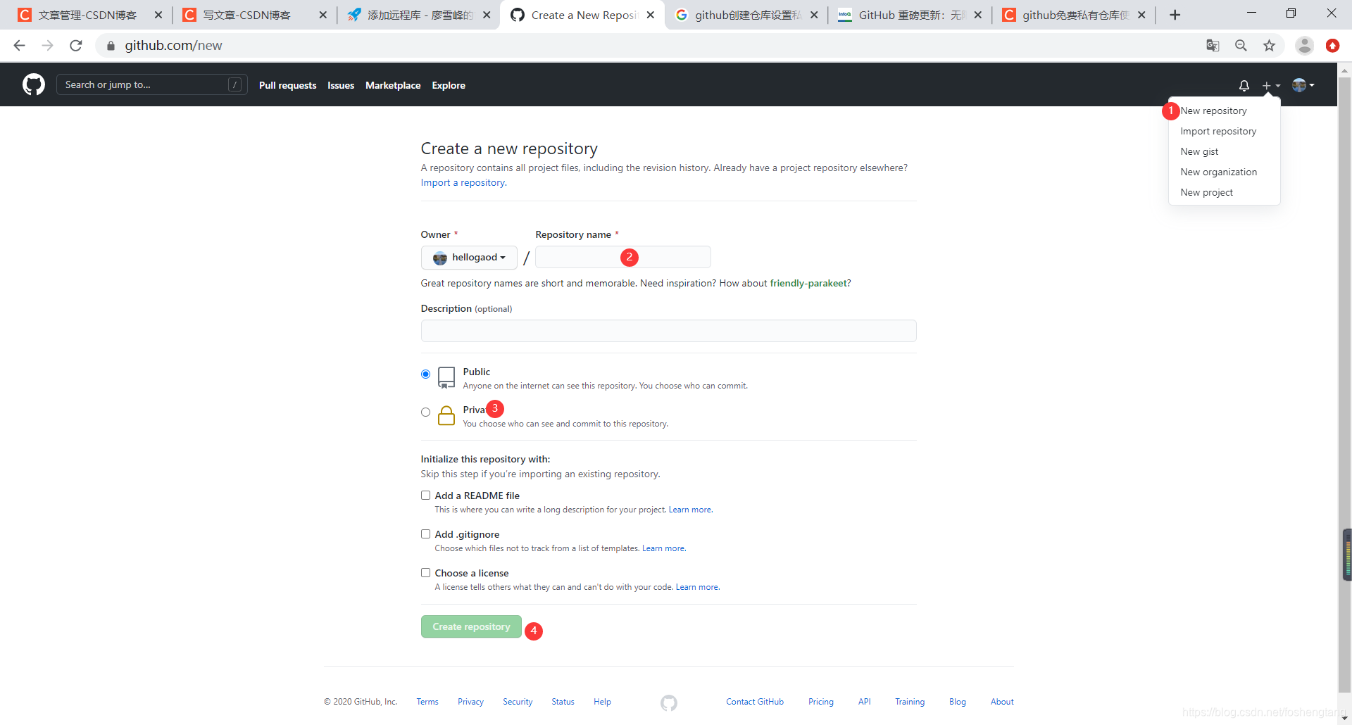 github创建仓库如下图(从2019年开始,github创建私有仓库免费,如果你不想让别人看到你的仓库,可以设置私有,实在不放心,后面还会介绍手动创建一个git仓库)