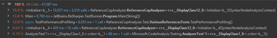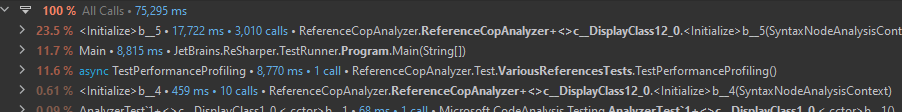 Well, I took a look this weekend. I changed the unit test you added to include timings and tested with the current as well as your new code. These are my results (run in Current code: After applying your improvements: I wouldn't call that a significant performance increase. On the whole it seems rather slow anyway. Once I have some more time, I'll see if I can make some structural performance improvements. By the way; if you look at the huge difference between the slowest and fastest runs, it seems like the test is not fully isolated and Roslyn does some optimizations/caching. I think that needs to be addressed as well for testing. |