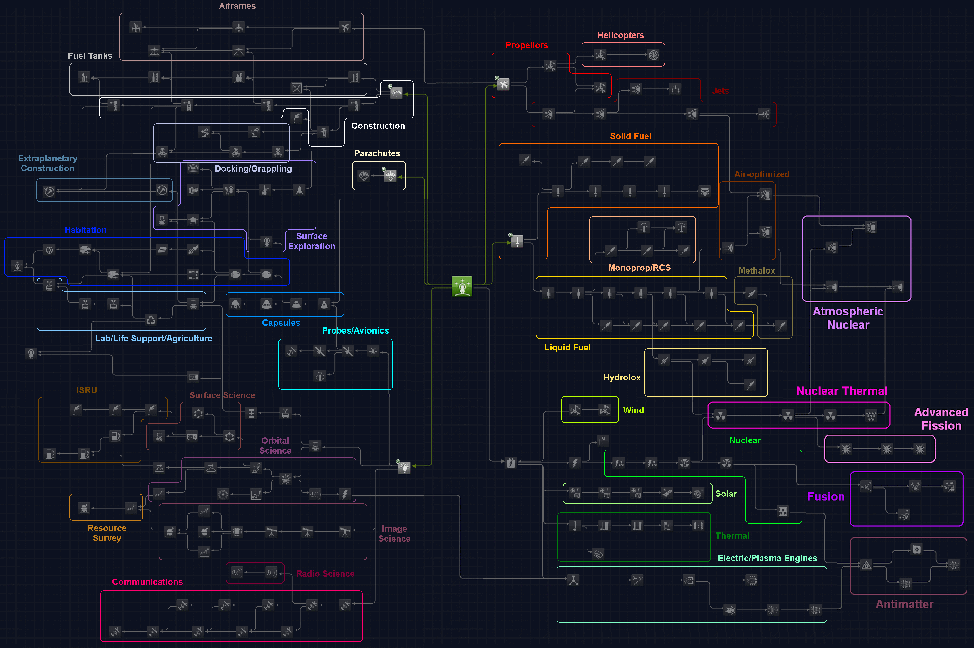 Aside from start, the tree is created using completely new nodes, meaning that only supported mods will appear on the tree, though as a fallback option there is a Lost and Found node that should contain all unsupported parts. The supported mods list is recorded in the mods spreadsheet and here, but to start out with these mods are highly recommended to properly fill out the tree and play as intended: