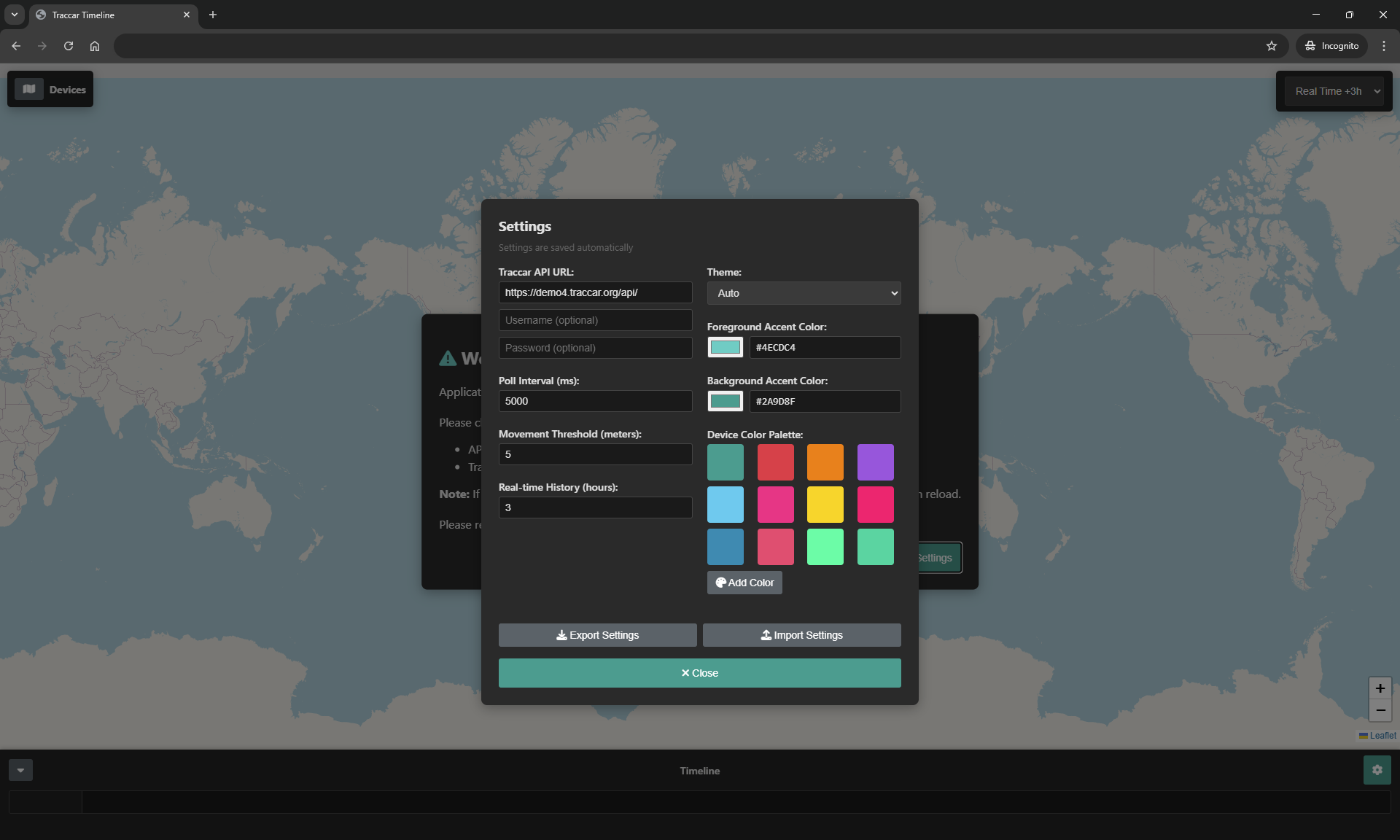 Note: On first run a popup will show complaining about the Traccar API url. Head into settings and enter the URL to your traccar API. Ensure you complete with the trailing slash.