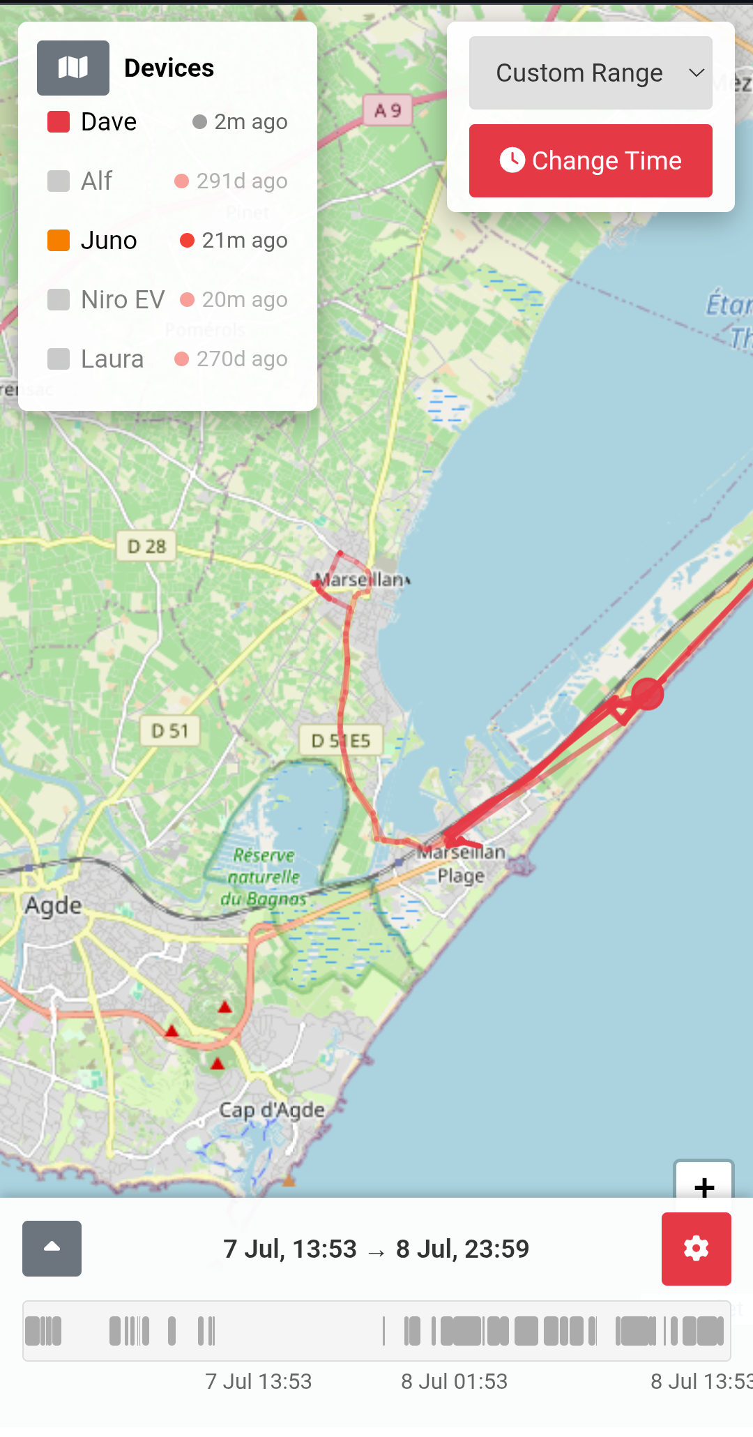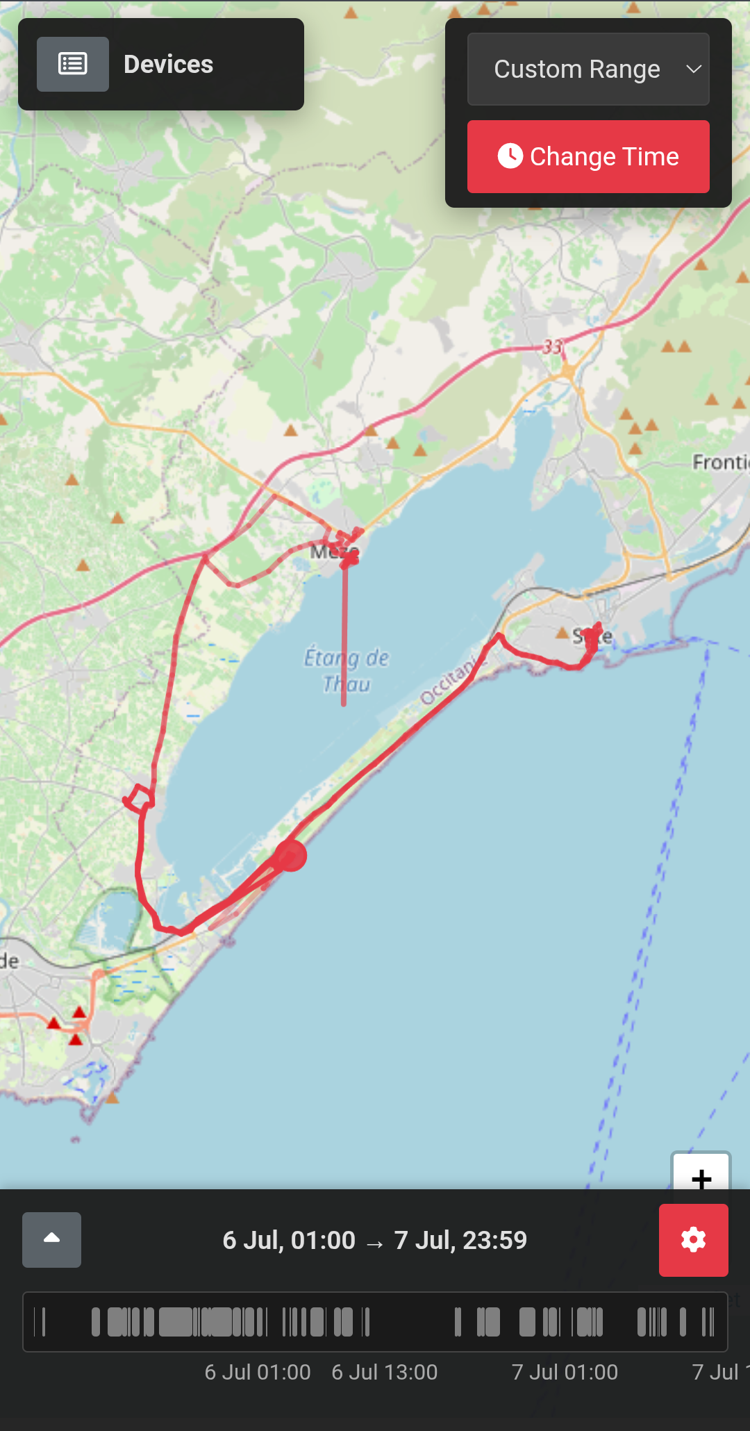 Simple html single page web app for viewing Traccar API GPS data. Uses timeline-based interface for device movements including real-time and historical data.