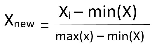 Selain pengecekan data dan pembagian dataset ke data latih dan data uji, kita juga perlu untuk mengatur skala data. Hal ini perlu dilakukan agar skor MAE kita tidak menjadi terlalu besar, jika hal ini terjadi, akan mengakibatkan prediksi kita sangat buruk. Oleh karena itu, saya melakukan skala data menggunakan MinMax Scaler. Berikut formula dari MinMax Scaler: