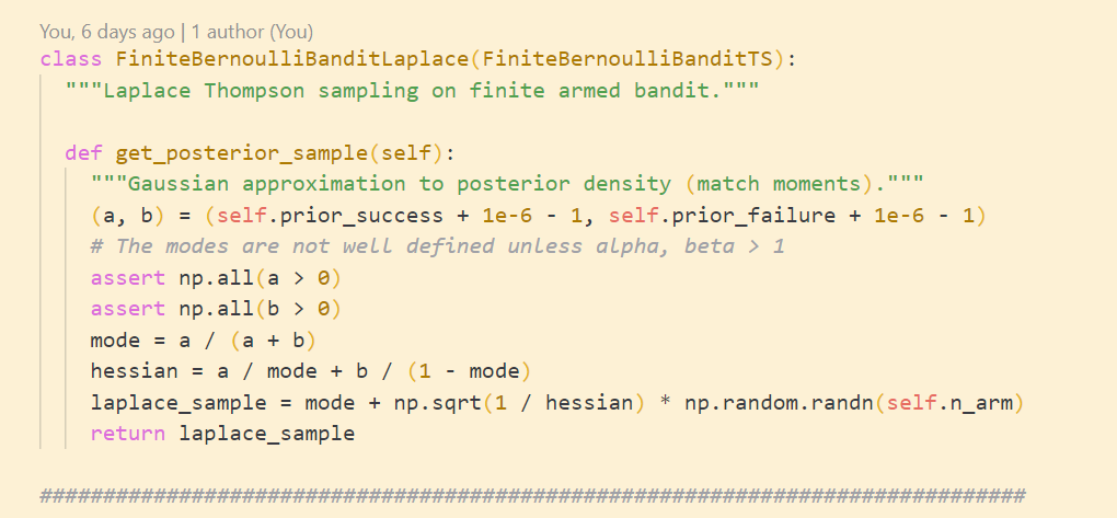 Hello~ I'm new to Thompson sampling. In the class FiniteBernoulliBanditLaplace in finite_arm.py, I'm a little confused about laplace_sample. How does the equation come out? And It doesn't look like the example in section 5.2. Can someone give a little help? I would appreciate any help.
