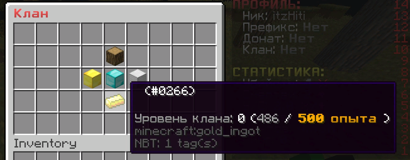 - GUI с информацией о клане, его опыте и уровне (/clan menu) + настройка предметов в GUI через конфиг