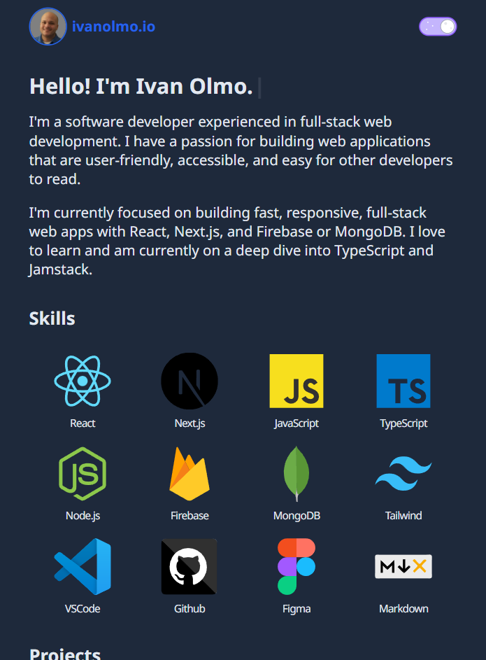 I chose to use Next.js because of previous experience, and because this site will almost certainly be 100% static. Next.js is great for serving static content, even if you're not taking advantage of any server side features. I do plan to add a page for each project so that there's space to expand on each one. A few lines of description per project isn't really enough.