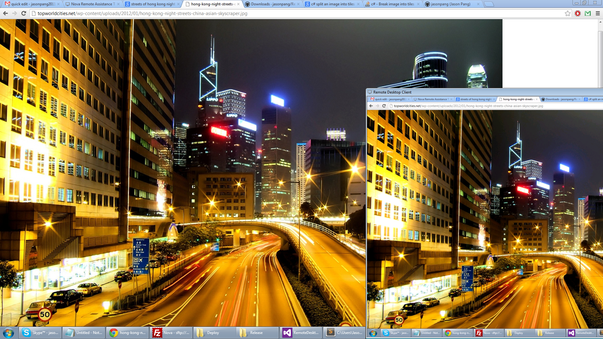Note: This project is pretty old and bloated. I recently wrote a much much smaller and slimmer version demonstrating basic usage, which works on Windows 8/8.1, if you're interested in just the screen capture functionality. The project is ScreenShare. Important differences between Screenshare and RemoteDesktop: RemoteDesktop has UDP hole punching implemented; ScreenShare does not and only works locally. RemoteDesktop uses a mirror driver for screen capture; ScreenShare does not and uses the native Windows Desktop Duplication API available in Windows 8/8.1. (August 20, 2015)