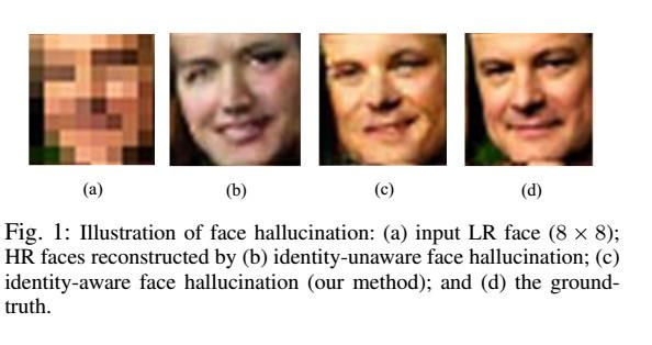 keywords={face recognition;image reconstruction;image representation;image resolution;iterative methods;learning (artificial intelligence);SiGAN;Siamese generative adversarial network;identity-preserving face hallucination;generative adversarial networks;high-quality high-resolution;identity preservation;identical generators;reconstruction error;identity label information;loss function;generator pair;face reconstruction;identity recognition;objective face verification performance;visual-quality reconstruction;unseen identities;face hallucination GAN;Siamese GAN;Face;Image reconstruction;Face recognition;Training;Generators;Image resolution;Generative adversarial networks;Face hallucination;convolutional neural networks;generative adversarial networks;super-resolution;generative model},