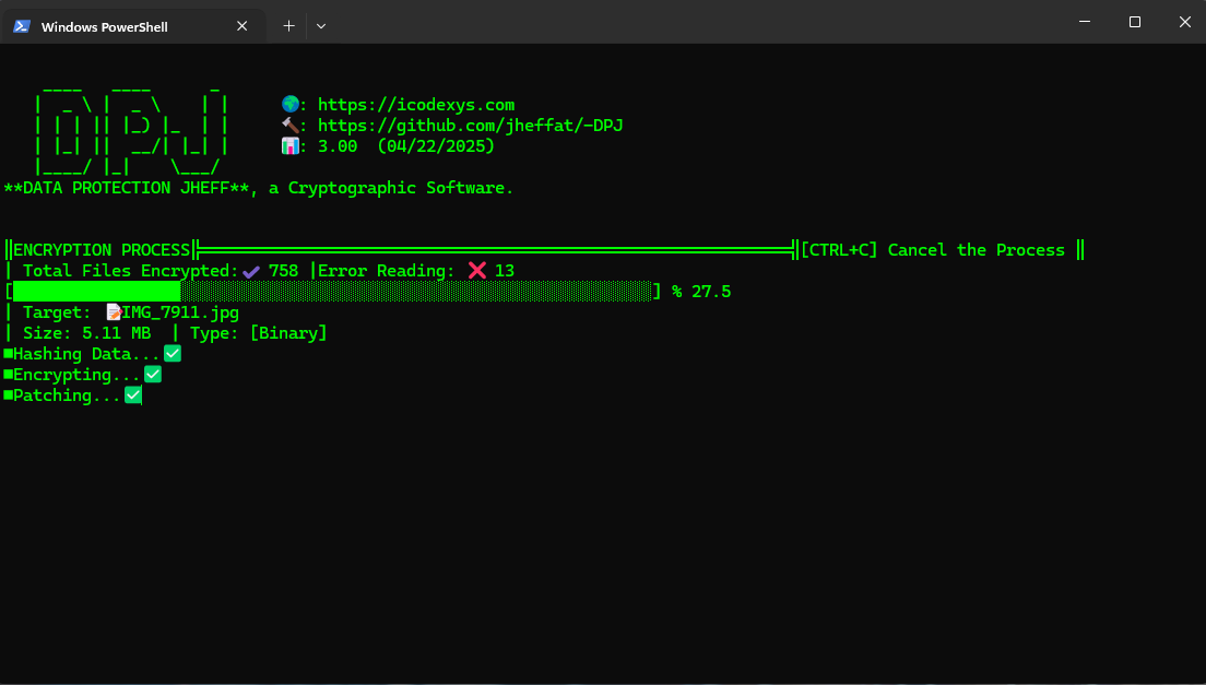 DPJ is a command-line data encryption tool, an improvement of Fixor 2.50(Discontinued). The Name Fixor changed to DPJ in honor of the my first encryption tool developed in QBasic and Visual Basic (2003–2007), DPJ is faster, AES-Like secure, and packed with new features designed to keep your data safe. Is a lightweight CLI tool, encrypt/decrypt files securely using custom-built methods. Good tool to encrypt your work projects or your sensitive data(documents, PDFs, photos, videos, etc.). -->✨ Changelog