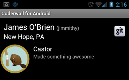 This application gathers a users profile from Coderwall.com using their profile API. It will display the user's name, username, location, a link to their github account if available and also a list of all their badges.