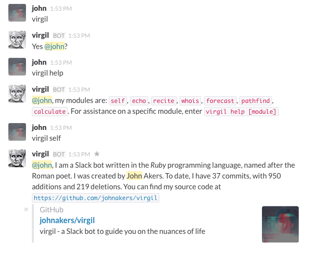 Named after the Roman poet... Virgil is a Slack bot, created in Ruby, that you can incorporate into your Slack.