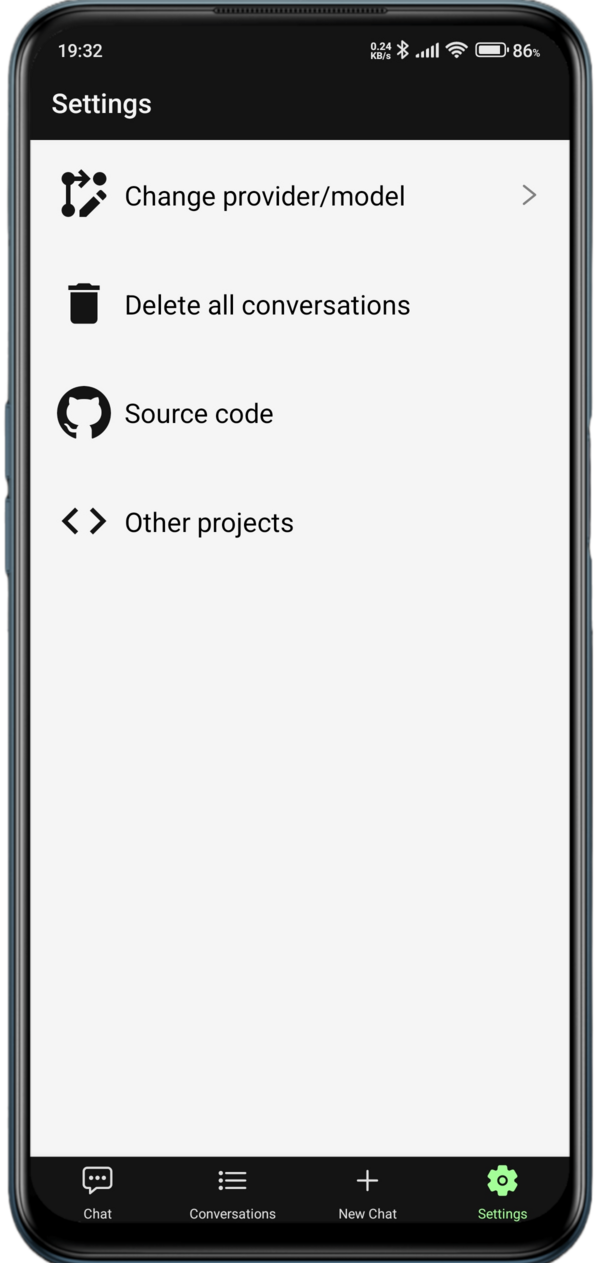})Dark mode✅Enter API key in app✅Switch between models✅Add Antropic as provider✅Add Mistral as provider✅Share entire conversation✅Haptic feedback✅