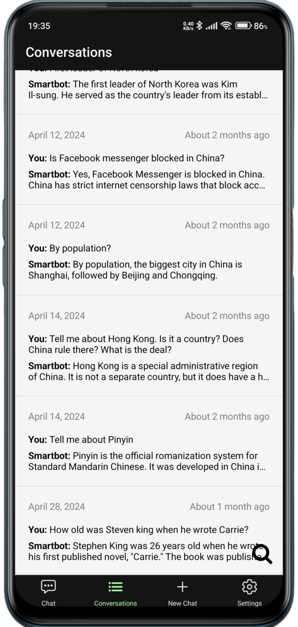 Smartbot is a native mobile app for Android that was built using React Native and the Expo framework. The app connects to one of the AI assistant providers chosen by the user. To manage state and actions across the app, it uses Redux Toolkit. When the app needs to get data asynchronously from the API, it uses the Redux Thunk middleware. The app also utilizes the Axios library for API requests, the Date-fns library for working with dates and times, and Redux Persist to persist some Redux state.