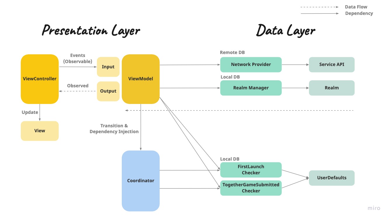 ViewController(View)는 화면을 그리는 역할을 담당하고,ViewModel은 데이터 및 비즈니스 로직 관리, 화면 전환 요청 등을 담당하도록 역할을 분리했습니다.- 추후 ViewModel에 대한 테스트 코드를 추가하여 안정성을 개선할 예정입니다.