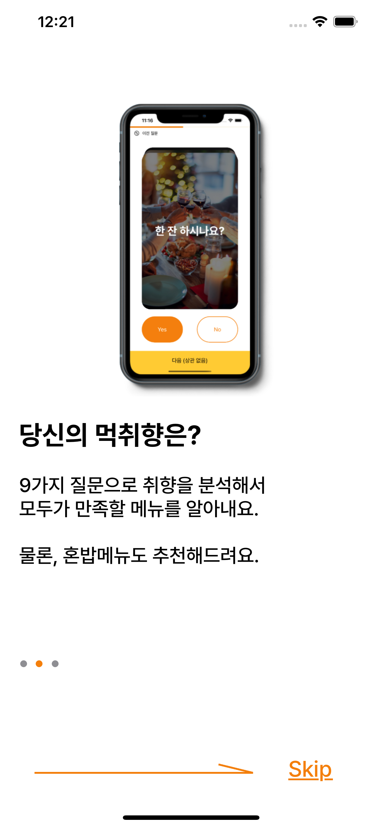 사용자가 앱을 최초 실행한 경우, 앱의 기능과 사용 방법을 소개하기 위해 PageViewController를 활용하여 OnboardingPage를 구현했습니다. 1~2페이지는 앱에 대한 설명을 나타내고, 3페이지에는 사용자가 못먹는음식을 제출하도록 했습니다.