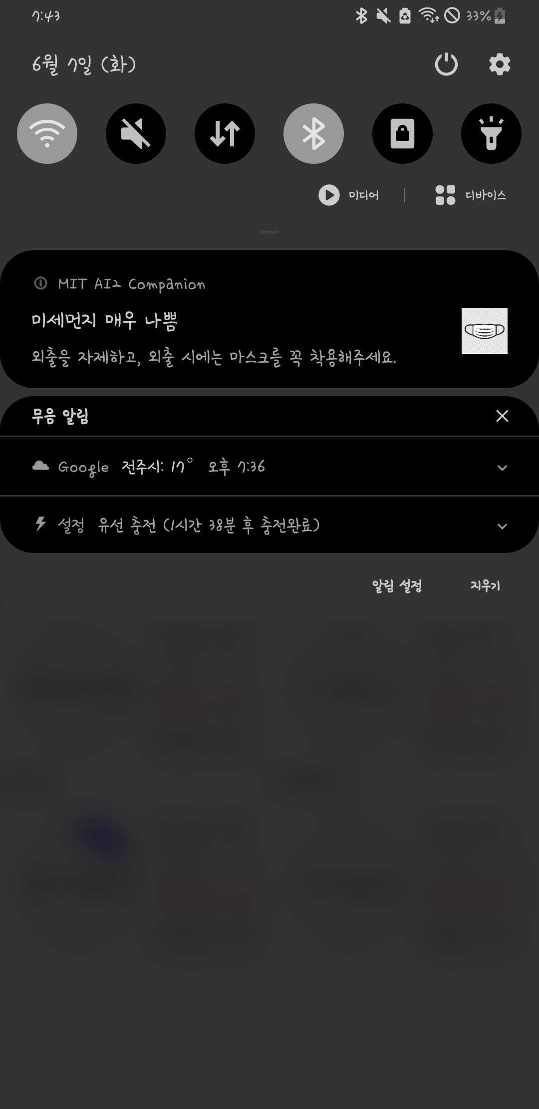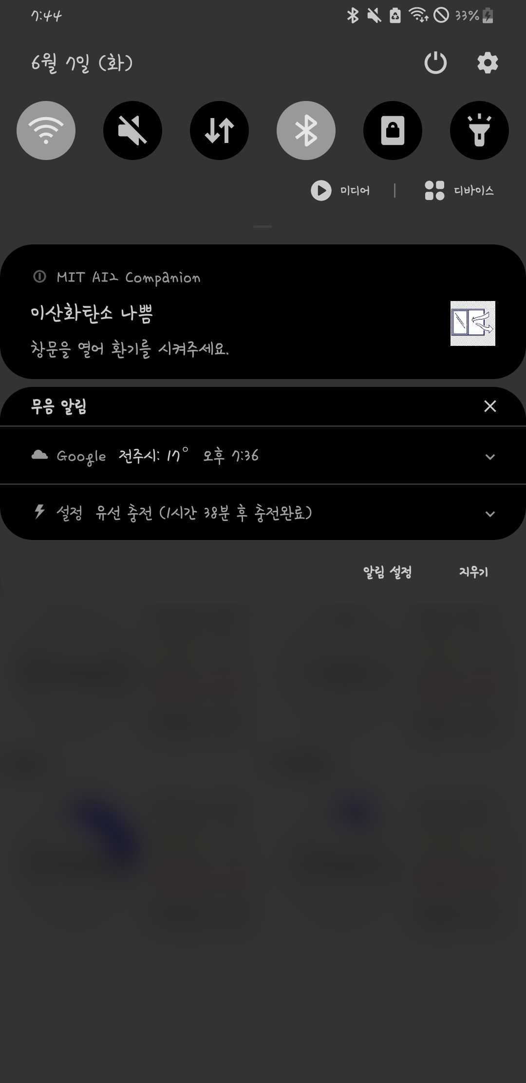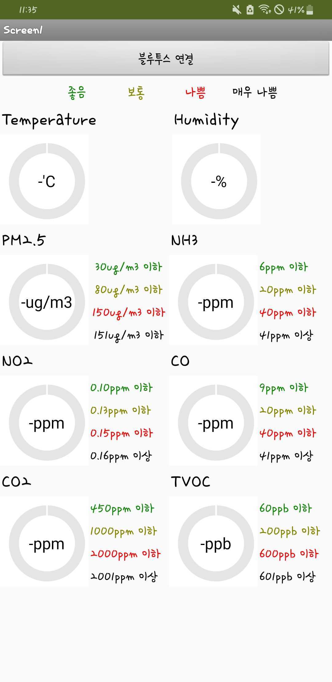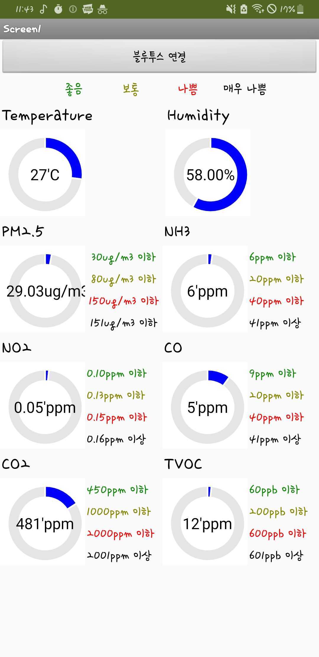 Arduino-Project-Air-Pollution 대기질 오염도 측정 및 알림 미세먼지 센서(GP2Y1014AU), 온습도 센서, 이산화탄소 및 TVOC센서(CCS811), CO-NH3-NO2센서(MICS-6814), 포름알데히드 센서(sen0231) + 알림 창에 미세먼지 - 마스크 / 이산화탄소 - 열린 창문 이미지 추가 + 회로도 추가 + 측정값 반환 화면 추가 회로도 MIT APP Inventor: 측정값 반환 화면 MIT APP Inventor: 미세먼지 나쁨일 때 알림 화면 80ug/m3 이상 시 5초동안 50개의 미세먼지 농도를 누적합하여 평균 산출, 평균값이 80ug/m3 이상이면 알림 설정 (매우 나쁨도 마찬가지) MIT APP Inventor: 이산화탄소 나쁨일 때 알림 화면 1000ppm 이상 시 50개의 이산화탄소 농도를 누적합하여 평균 산출, 평균값이 1000ppm 이상이면 알림 설정