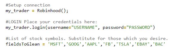 If you already had an account with Robinhood, or skipped setting one up, now's the time. In order to Ruth to run, Boaz has to have your credentials. Open up boaz.py in your favorite IDE or code editor (definitely Sublime Text 3). Locate the easy-to-find area to enter your credentials marked "YOUR_USERNAME" and "YOUR_PASSWORD" respectively: