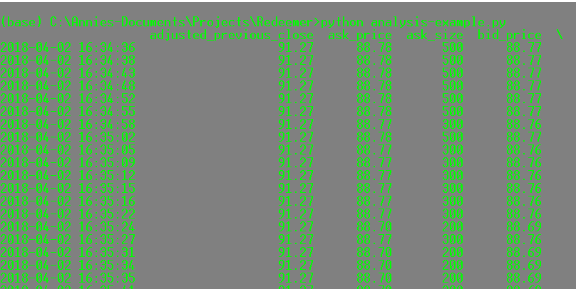 The easiest way to analyse the data in these files is by reading them into Pandas. I've created a simple example script anyone can use to plot their data. When you run the program it will plot the ask price according to the time and date associated with the JSON data. The example pulls from Microsoft (MSFT) data, so in order to run it, you need to first run 'redeemer.py' requesting the MSFT data to create the datastore. This operation will create a much more interesting data visualization if the data is coming from a living market, so run it while the market is open. Then you can simply call python analysis-example.py and it will plot the data. When you close the plot window, it will print to the console the data as a Pandas DataFrame. It should be pretty simple to customize this is in a myriad of ways.
