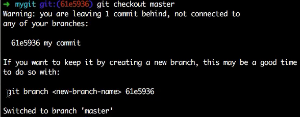 git checkout commit_id 切换到某个历史提交点(此时处于在游离的分支上的状态),在这个游离的分支上可以修改、提交、切换分支,切换之后会有如下提示: