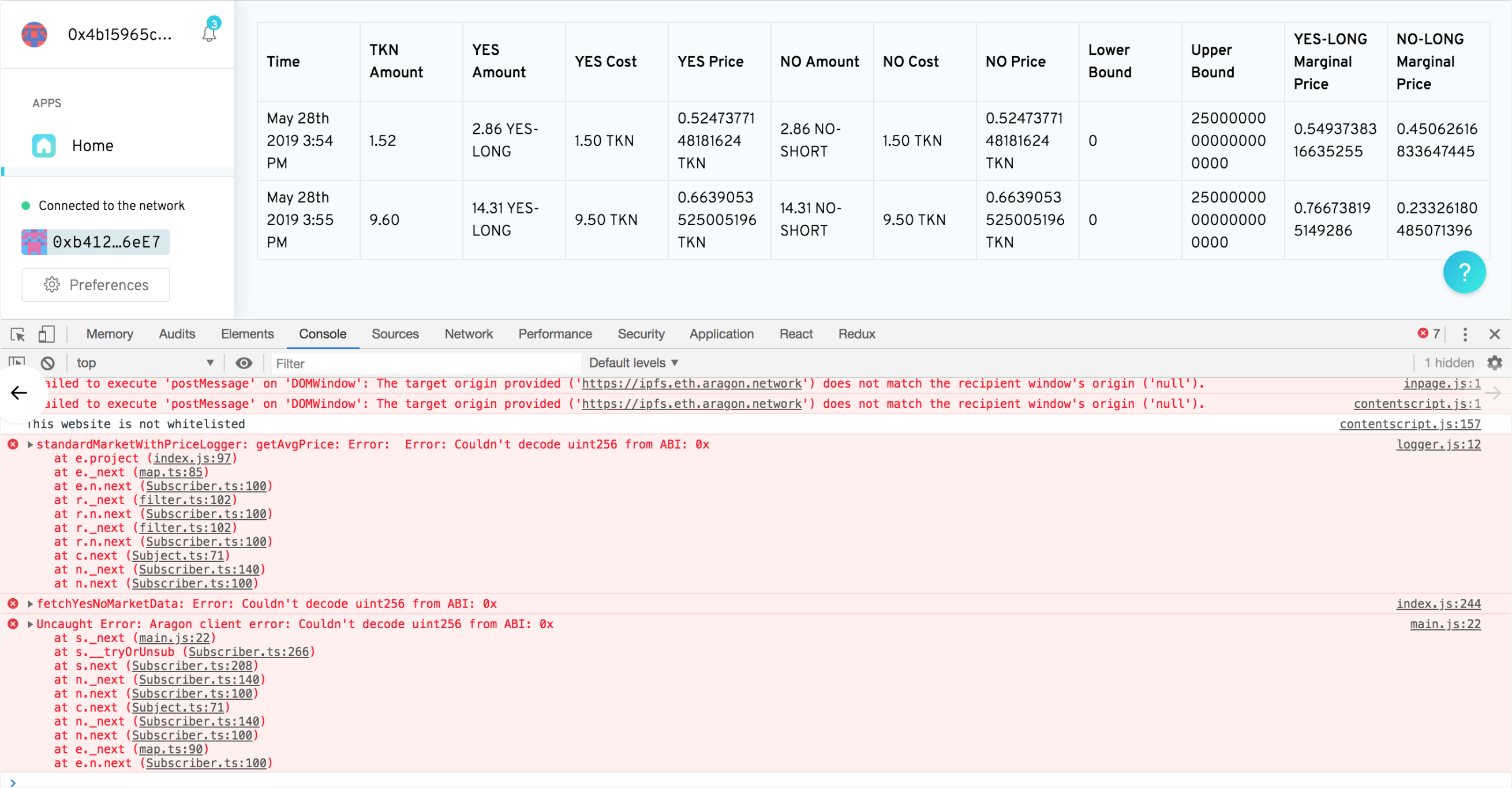Repro steps: 1. With the JS console open, make a few trades on markets (I tried with 1.5 TKN and 9.5 TKN) 2. Navigate to trade history 3. Wait for tx's to confirm